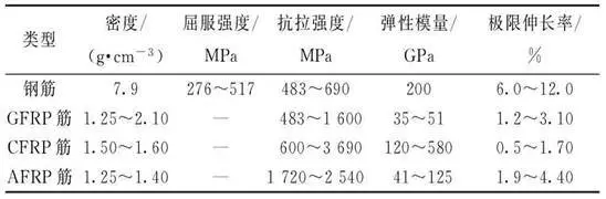 在處于惡劣環(huán)境條件時,如干濕交替、化學介質(zhì)等作用下,普通鋼筋極易發(fā)生腐蝕,嚴重影響結(jié)構的耐久性和適用性,導致結(jié)構承載能力的降低。在這種情況下,防腐性能好、黏結(jié)性能與鋼筋相差不多且抗拉強度高的FRP筋成為代替鋼筋的一個較好選擇(表1)。