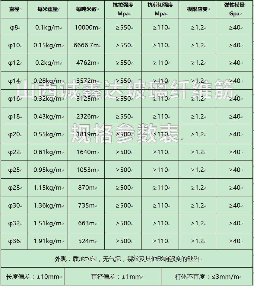 力學(xué)性能:參照上方玻璃纖維筋規(guī)格表
